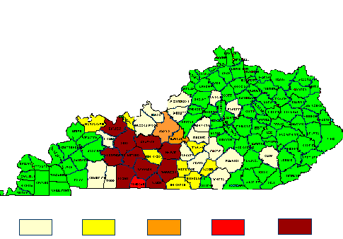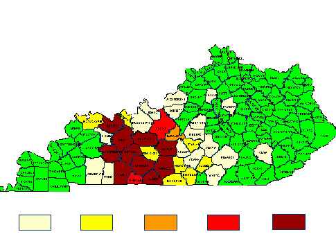 To date, participants in our summer projects have come from 37 different counties in Kentucky. The map below shows relative concentrations.