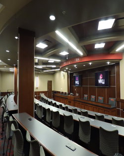 Standard Setup: 3 levels of tiered seating with fixed desks for 70 individuals. There is a fixed head table for 9 individuals in the front of the room.