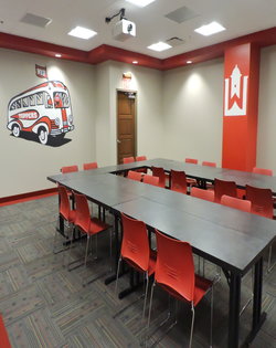 Standard Setup: Conference table in a U capable of seating 25 individuals. Additionally, there is one head table in the front of the room.