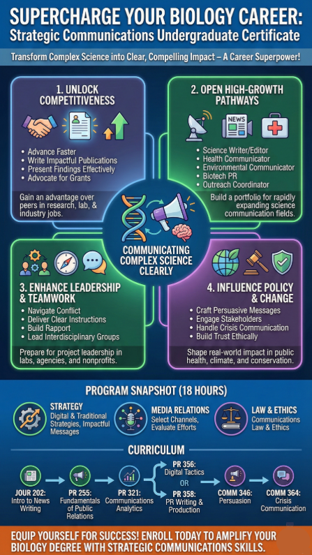 Biology shapes many sectors, from medical advances to conservation, climate policy, and public health. These efforts only succeed when people understand and support them. With the Strategic Communications Certificate (1767), you'll learn how communications, marketing, and PR bridge that gap by turning complex biology into clear, motivating messages. Supercharge your biology career.