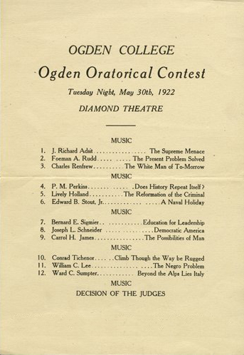 A 1927 source notes that Ogden sent a student to compete in the regional qualifier for the National Intercollegiate Oratorical Contest again, but no source yet provides any more information.22