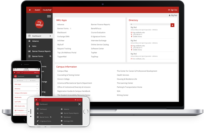 In addition to the Home screen, myWKU has new dashboards for both students and faculty/staff. On the Student tab, you can check grades or class schedules, while Faculty and Staff can use their dashboard to find employee services and quick links. You can access any of these 3 dashboards by selecting the tabs in the red bar at the top of the page.