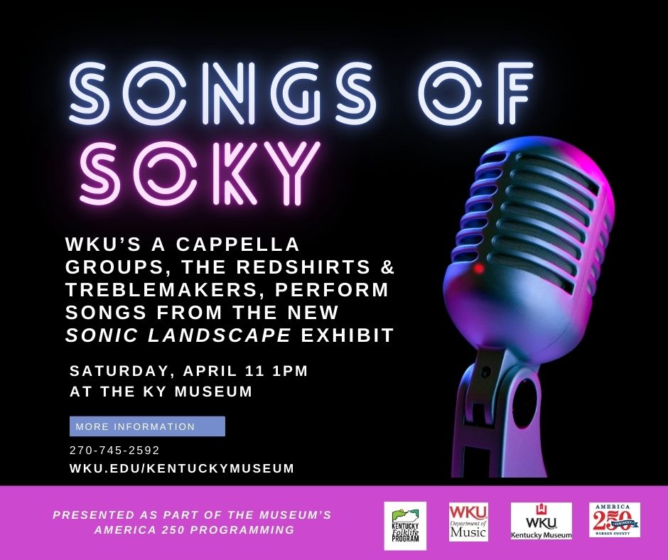 Presented by Dr. Liza Kelly and WKU’s premier a capella groups (Redshirts and Treblemakers), this program features songs from Sonic Landscape that tell the story of Southcentral Kentucky’s musical traditions and innovations. Dr. Kelly will narrate this story, empowering audiences to hear and feel the history come alive again. Click here for flyer.