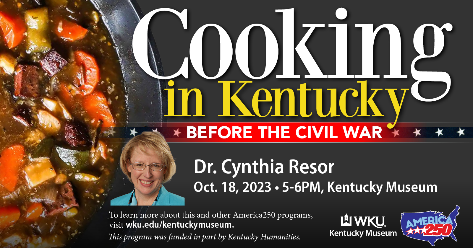 Presentation by Dr. Cynthia Williams Resor, Foundation Professor, College of Education, Eastern Kentucky University. This program will explore the lives of Kentucky women, free and enslaved, as Resor prepares recipes from early nineteenth century cookbooks such as Lettice Bryan’s The Kentucky Housewife. Reviewing how women produced, preserved, and prepared food in pre-industrial kitchens, Resor explores the often-overlooked “women’s work” of the past and present and how teaching it can enhance our understanding of everyday Americans.