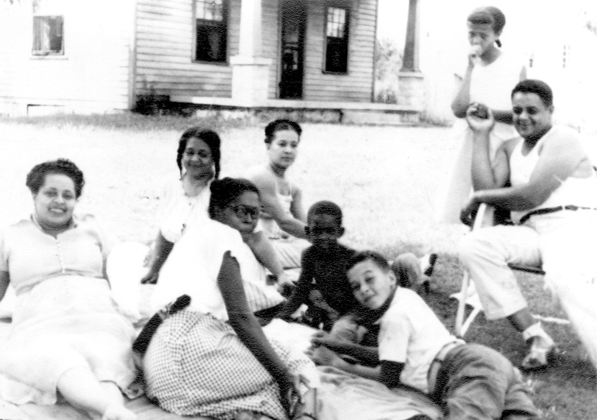 Marilyn Ellen, Corrine Bailey, Mary Austin, Hershel Austin Jr., James Bailey Jr., and Nancy Bailey relaxing outside Virgil Bailey's home.