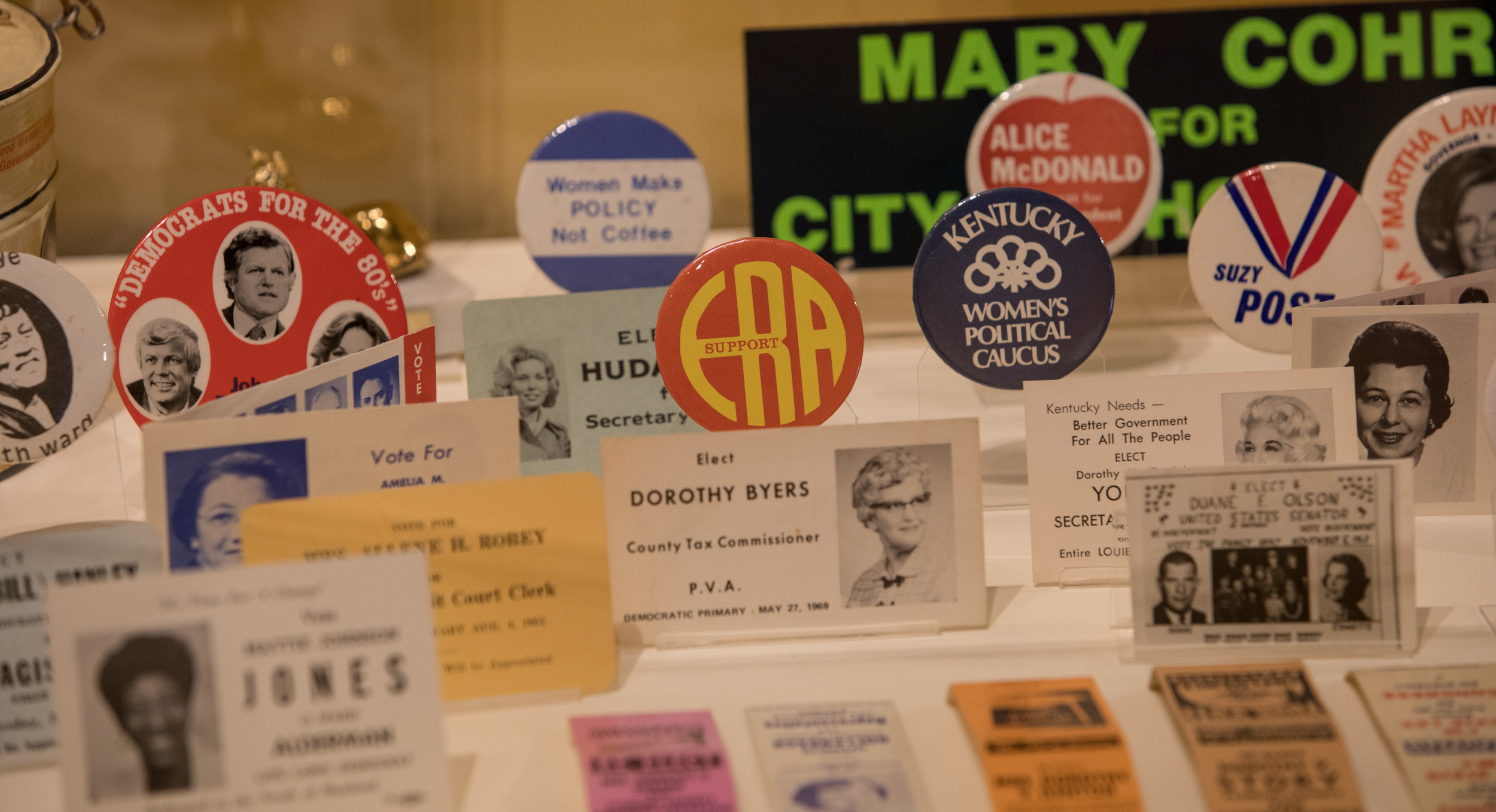This exhibit is drawn in part from the Rather-Westerman Collection. Named for its primary donors – WKU alumni Julius Rather (1958) and Robert Westerman (1971) – this collection holds over 10,000 artifacts that tell the story of political life in Kentucky. Objects in this collection are held jointly by the Kentucky Museum and WKU Department of Library Special Collections, and used in a variety of programs, courses, and exhibitions.