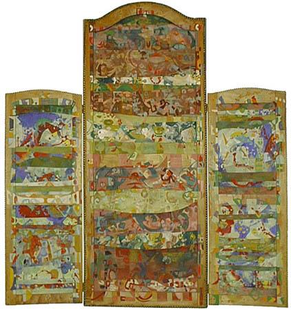 Joe Downing "And These Times Were" triptych, oil on leather on wood 64.5 x 71 inches