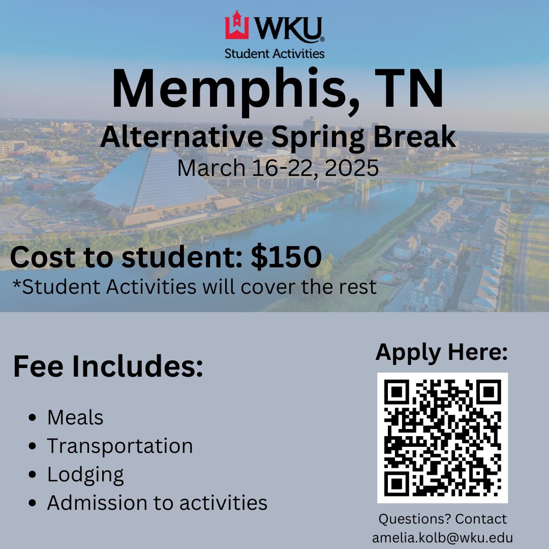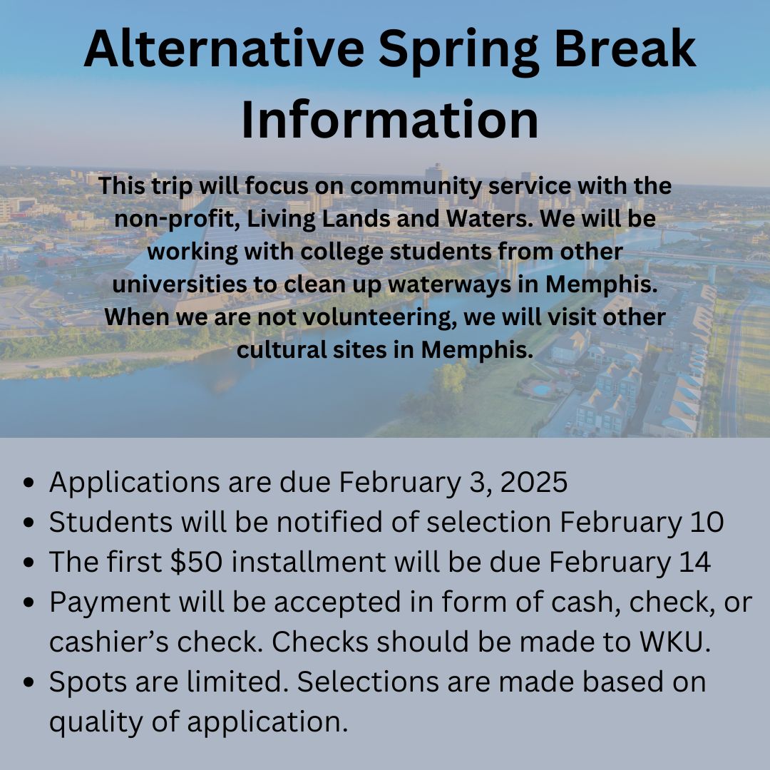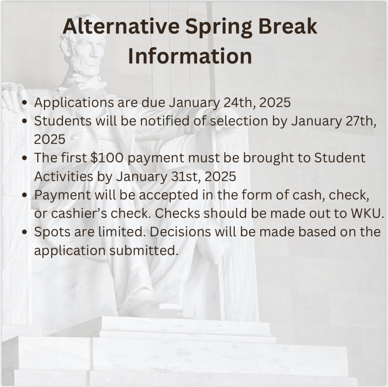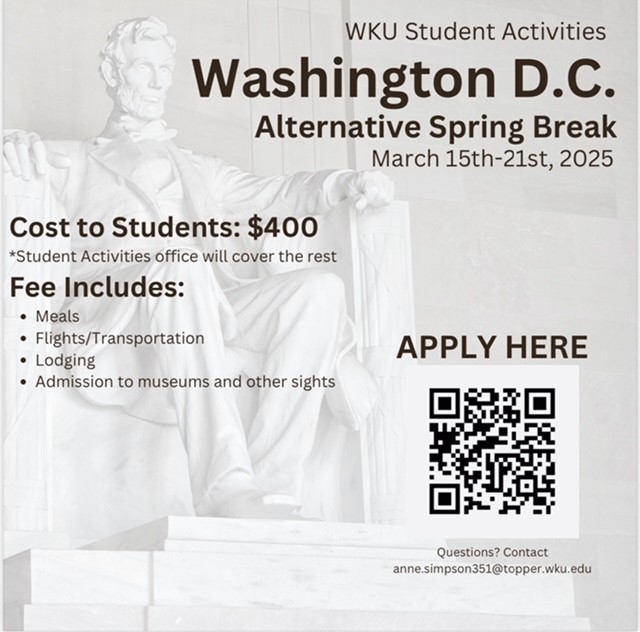 Washington DC application CLOSED: Join WKU Student Activities on an alternative spring break trip to Washington D.C. (March 14 - 20, 2026). Students attending will see cultural sites such as museums and the Capitol building. Students will also participate in one day of community service. Cost to student is $400. All meals, transportation, and lodging are included. Spots are limited, so put best foot forward on your application!