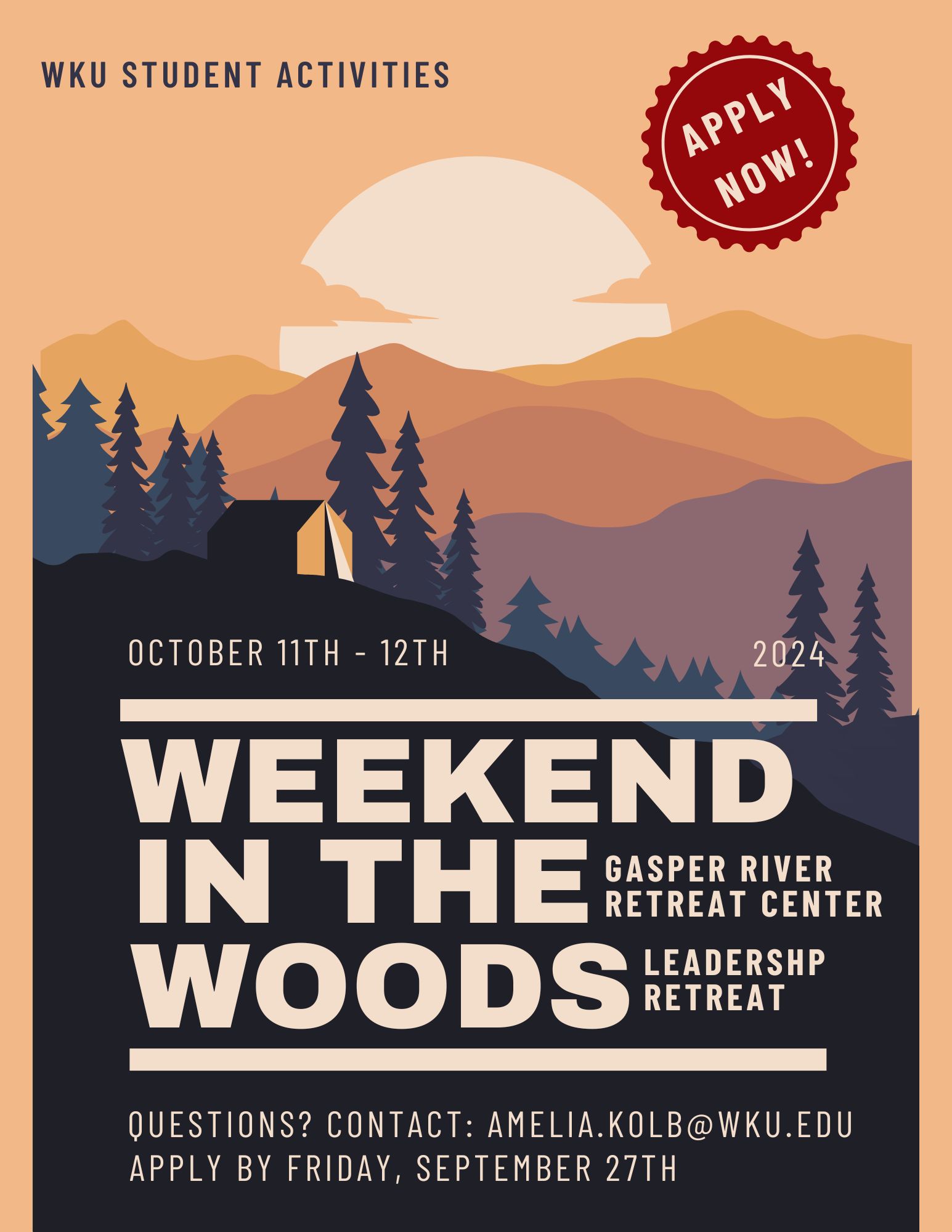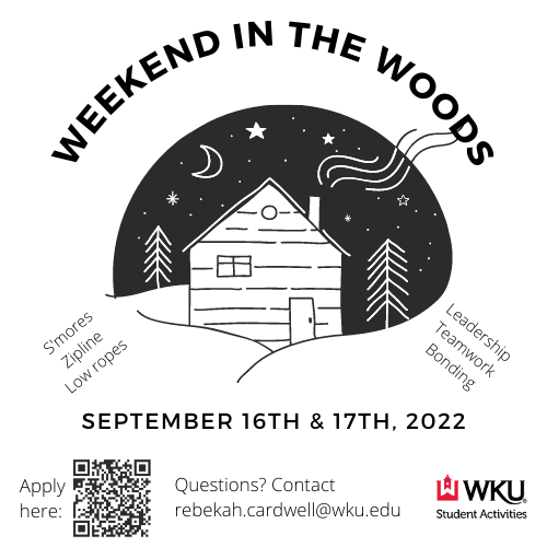 Weekend in the Woods is a 2-day leadership retreat, geared toward freshman and sophomores; however, any WKU student is eligible to apply. This retreat is hosted by the Department of Student Activities at Western Kentucky University with hopes to get students involved at WKU. Not only will students get to spend a weekend in the great outdoors with your peers, but also: