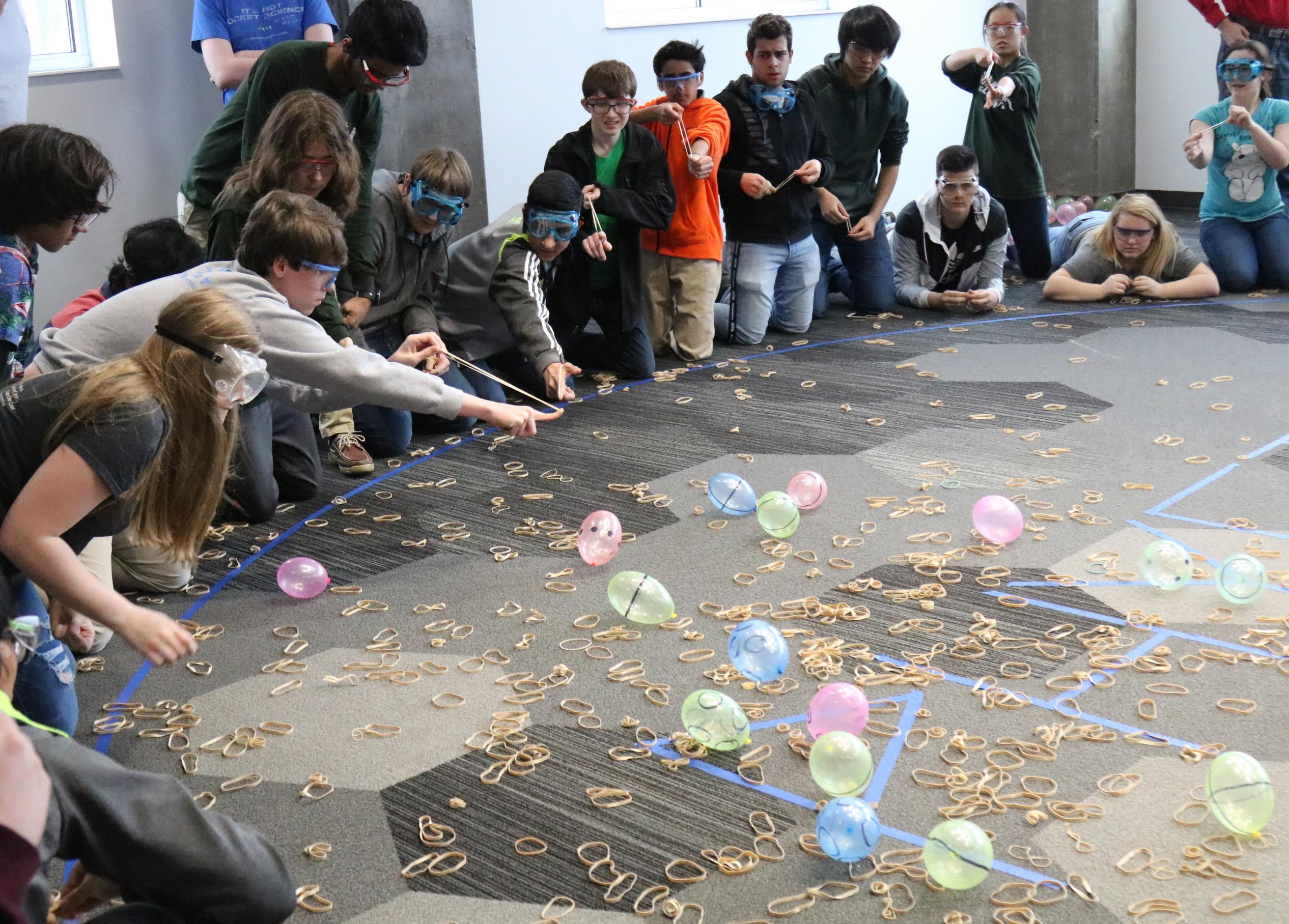 This year's "Impromptu Team Activity" required competitors to use rubber-bands to displace balloons inside a large circlular playing field.