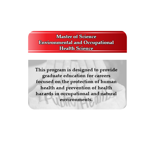 This graduate program in Environmental and Occupational Health Science is designed to provide graduate education for careers focused on the protection of human health and prevention of health hazards in occupational and natural environments. A key component of the program is to understand how exposure to environmental and occupational hazards occurs and discovering ways to reduce and control the risk of exposure. This program is designed for working professionals and students desiring opportunities with industry, consulting firms, government agencies, and other environmental and occupational health science professions. This program requires 36 graduate credit hours.